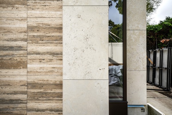 Een bijzondere uitdaging vormde de voegbreedte tussen de natuurstenen elementen. Waar de architect aanvankelijk uitging van een voeg van 2 millimeter, bleek uit onze technische analyse dat een voeg van 4 millimeter noodzakelijk was om voldoende ruimte te bieden voor thermische werking en vorstbestendigheid. De buitenkozijnen zijn in staal uitgevoerd met een minimale afmeting, waardoor ze volledig weggewerkt zijn achter het natuursteen.